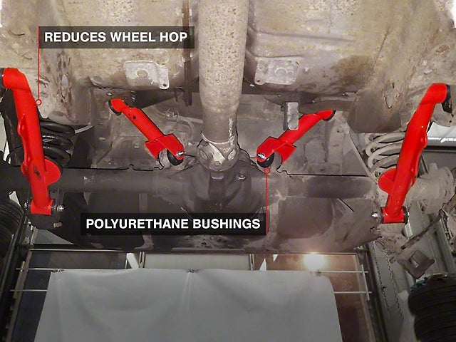 Replace those weak stamped steel stock control arms on your 1979-2004 Mustang with a Complete Rear Control Arm Kit to significantly improve traction for quicker launches and to reduce annoying wheel hop under heavy acceleration or braking.
