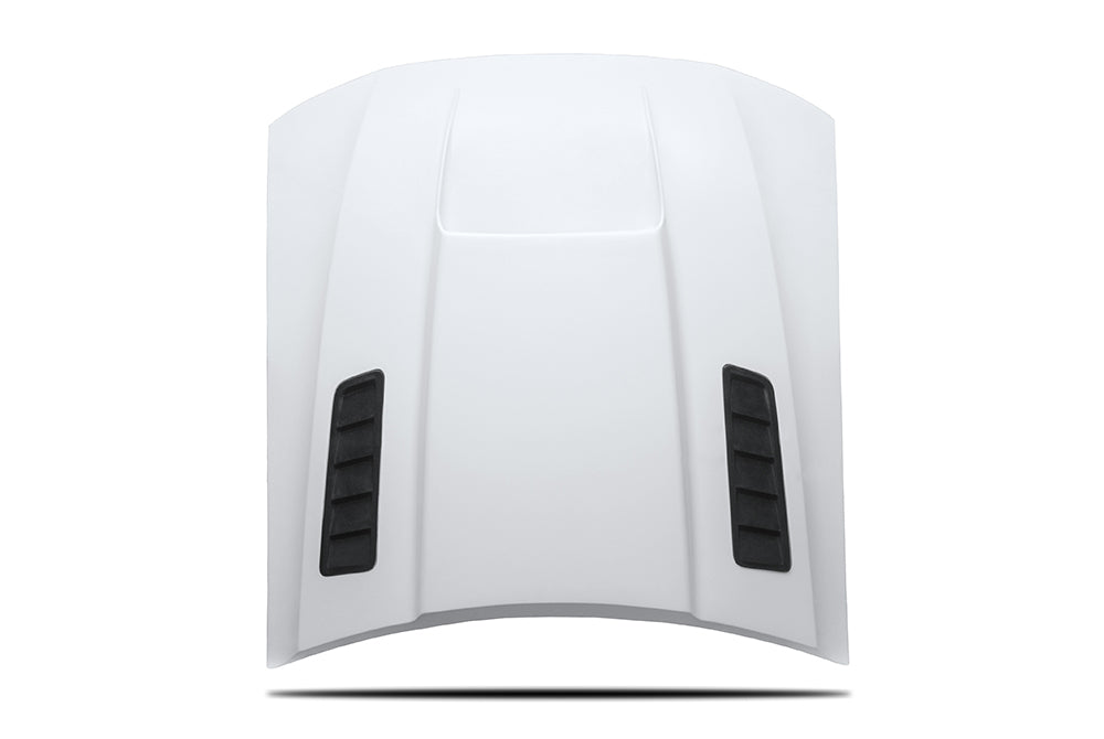 The Mustang Stalker 2 Hood features fully-finished underside liner for extra durability. It is composed from premium hand laid fiberglass and is guaranteed to fit perfectly with no trimming or modifying required. Installs in all factory locations and utilizes the OEM hood latching system.