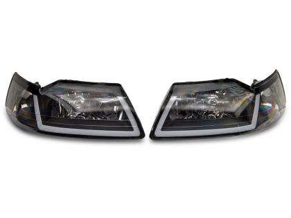 These Axial Headlights with Sequential LED Bar; Black Housing; Clear Lens are designed to fit 1999-2004 Ford Mustang models. Driver and passenger side included. Reuses factory bulbs.