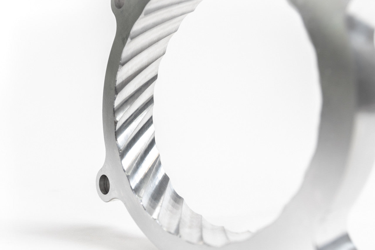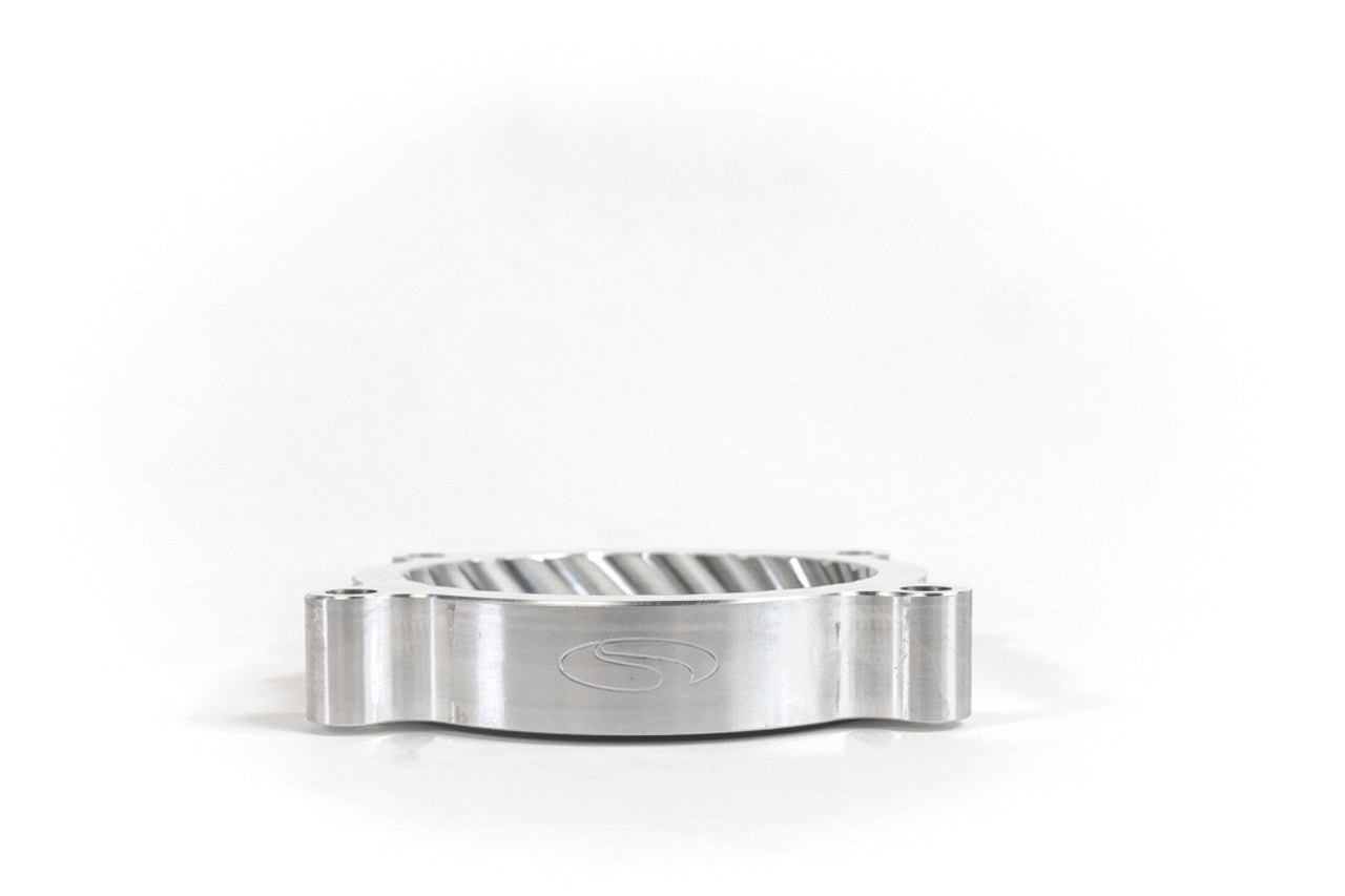 Steeda designed and manufactured this billet aluminum throttle body spacer in-house for the 2011+ Mustang with the 5.0 liter 4V Ti-VCT V8 Coyote modular engine. Made from Billet 6061 aluminum it is designed to create more plenum volume for increased horsepower and better performance from your Pony. The swirl design helps promote airflow by breaking the surface tension of the incoming air.