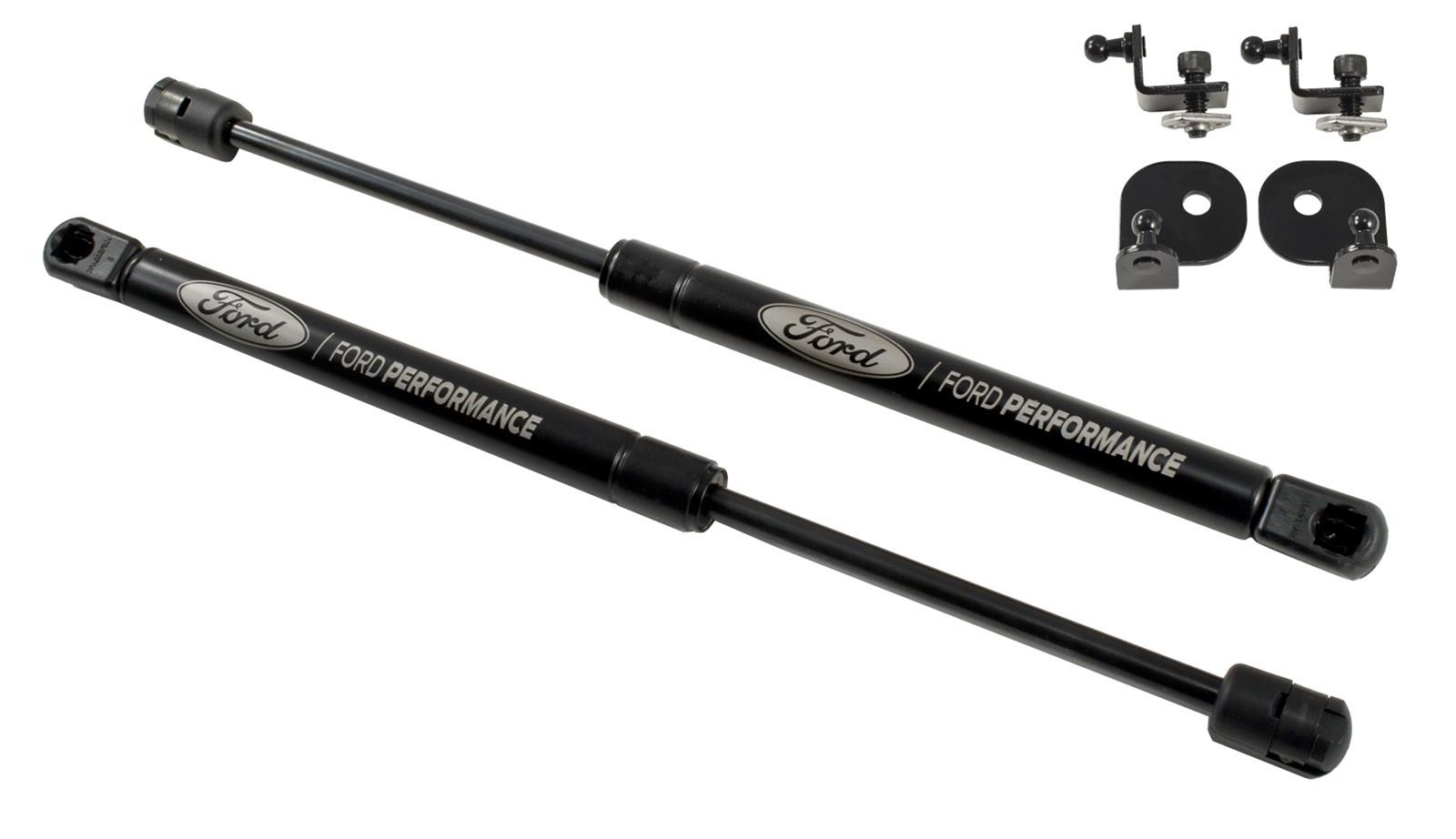 Ford Racing has manufactured these hood struts from lightweight steel and aluminum. This hood lift kit features durable black powder coated finish and a precision laser engraved Ford Performance logo to give you engine bay a cleaner, but stylized appearance. This kit includes all necessary mounting brackets to install these hood struts and get rid of your old hood prop.