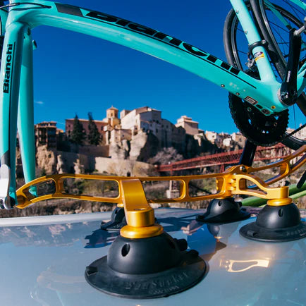 Is our Komodo the most beautiful bike rack in the world? We certainly think so. This road-bike-specific rack is machined out of solid aluminum so that each part fits with precision. Anodized in a variety of colors; Black, Silver, Blue, and Gold. This rack is designed for sports cars and convertibles – cars that don’t have a lot of open space to attach a rack, but this beauty can be used on any car. Thanks to its articulating feet, you only need 18" x 12" of space to mount the rack.