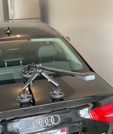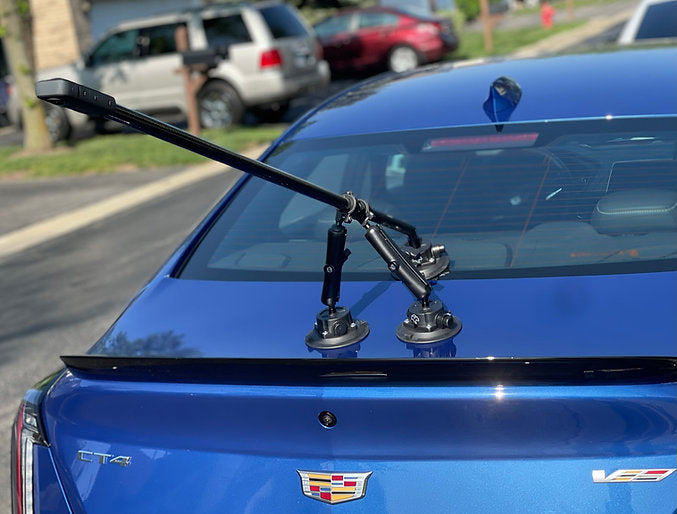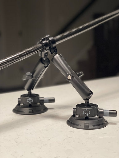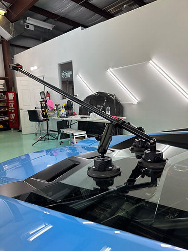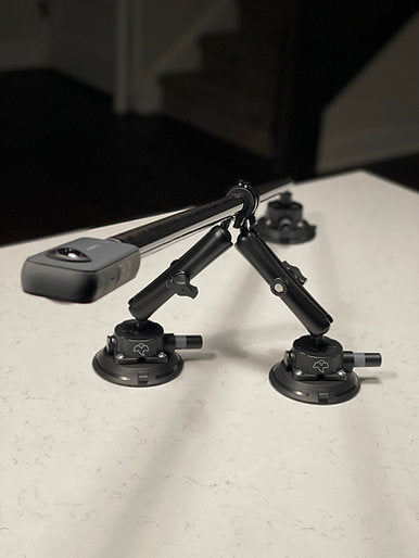 This is our triple (tripod) setup. Utilizes (1) 4.5" vacuum pad camera boom and (2) 4.5" vacuum pad support arms, both arms being 15cm in length. This has been tested from a dig on 2000whp+ track-dedicated vehicles.